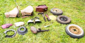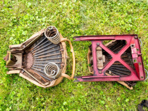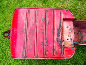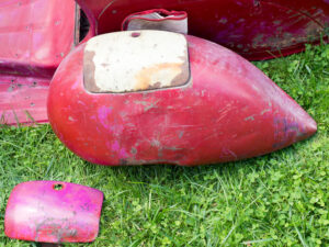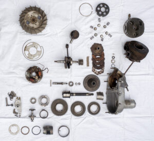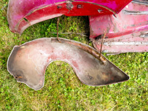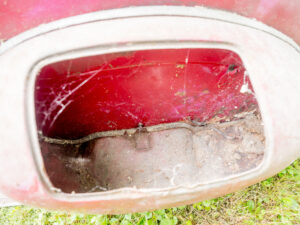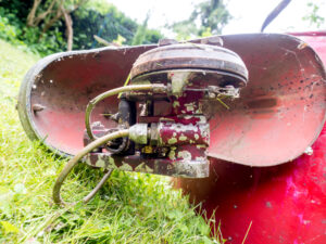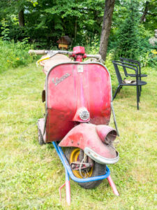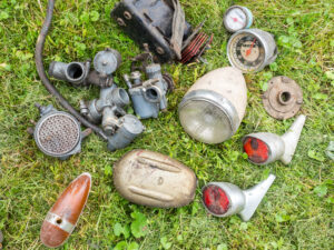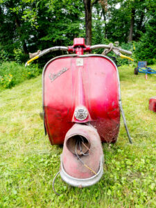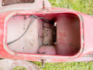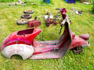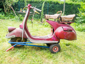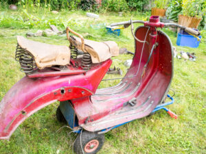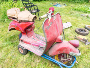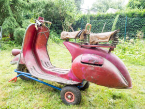 Drei Jahre später, 1985, es gab damals so eine seltsame Zeitung ‚Such & Find‘, habe ich ein Kleinanzeige gelesen ‚Sammlungsauflösung Motorrad ‚. Nur ca. 30 km zu Fahren. Also habe ich mir das angesehen. In der Sammlung war eine Vespa Roller Bj. 1954 der halbwegs komplett aussah. Der Motor war zumindest nicht fest. Der Roller sollte 150 DM kosten. Das kam mir sehr günstig vor und ich habe den Roller gekauft. Ein Problem war der Transport, ich war mit meinem DAF 44 unterwegs (damals kein Oldtimer).